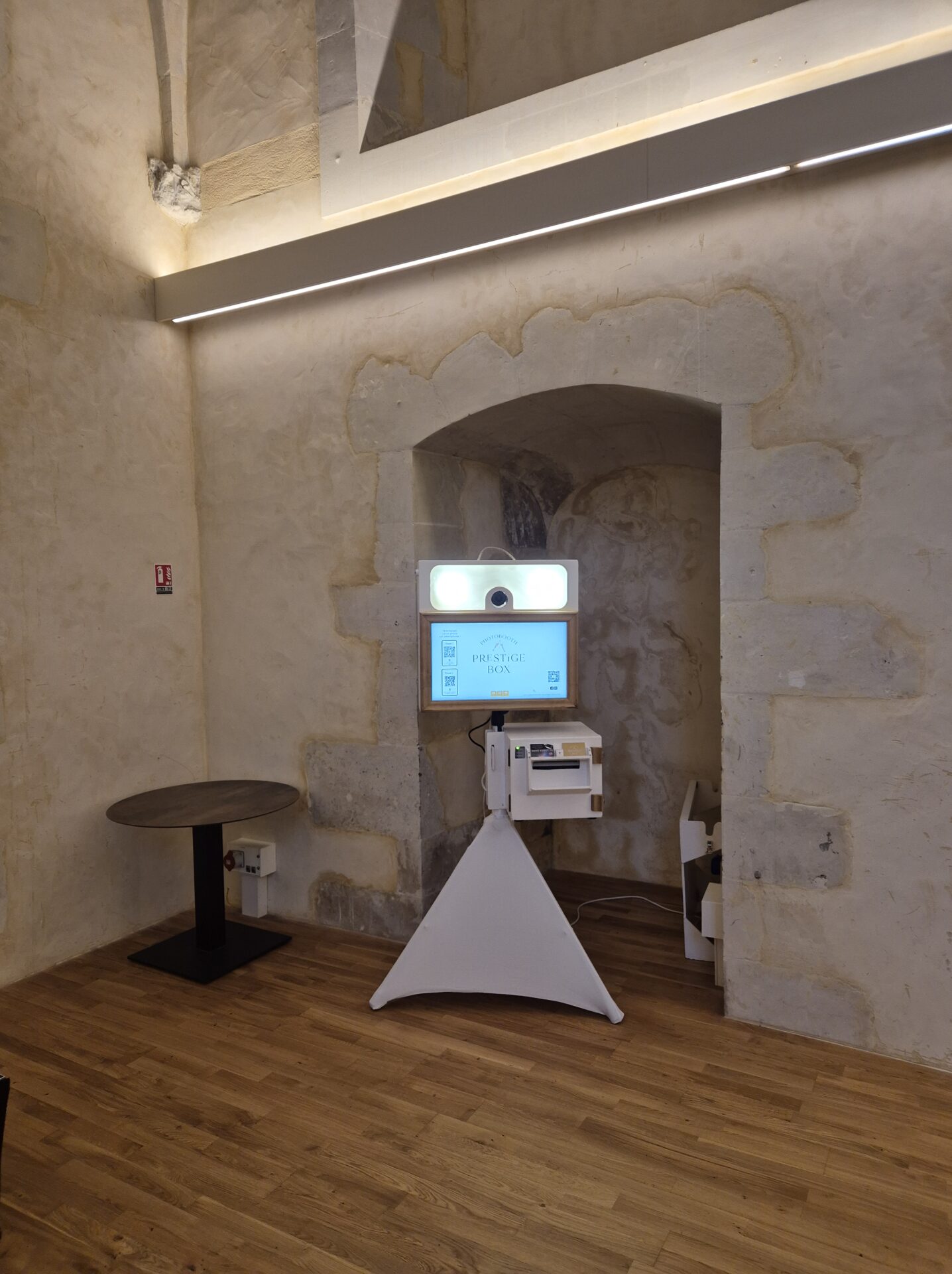 Borne Photobooth haut de gamme avec grand écran tactile 15,6″. Une interface simple, rapide et fluide.